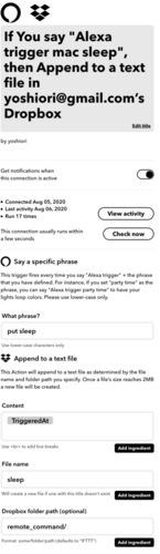 いろいろなハックを組み合わせた結果「コンピュータ、仕事開始」っていうと部屋の電気がついてサーキュレータの電源が入りタイムカードが押されてジャズが流れるようになり「仕事終わり」って言うと電気とサーキュレータと音楽が止まりタイムカードが押され…